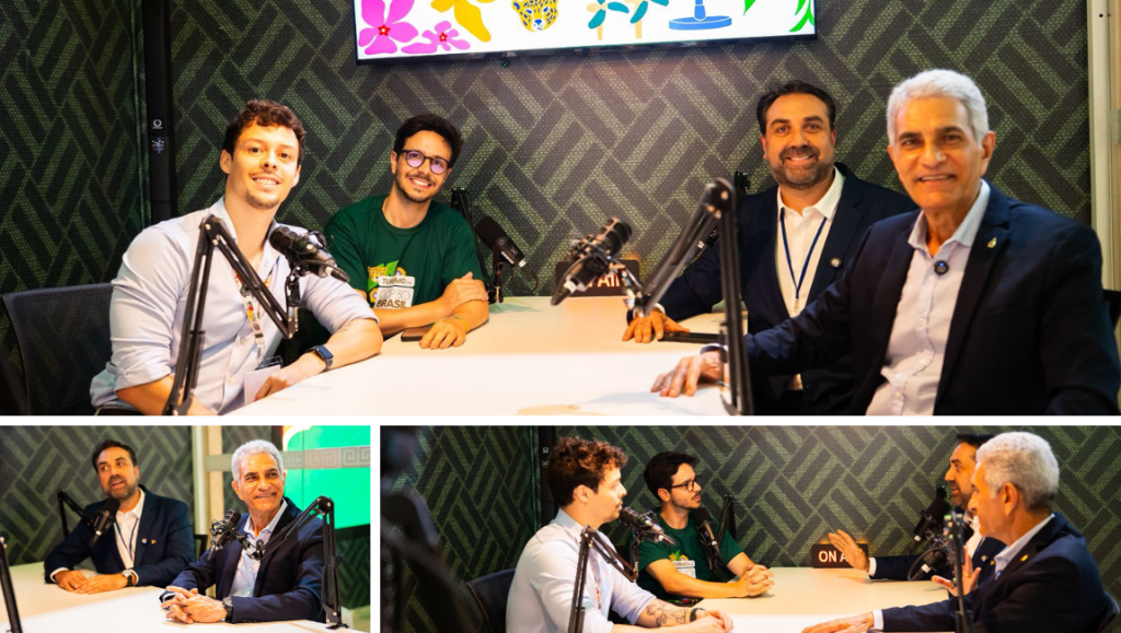 Dentro do estande “Conheça o Brasil”, localizado na Green Zone da COP30, o Ministério do Turismo conta com um estúdio dedicado às gravações e transmissões