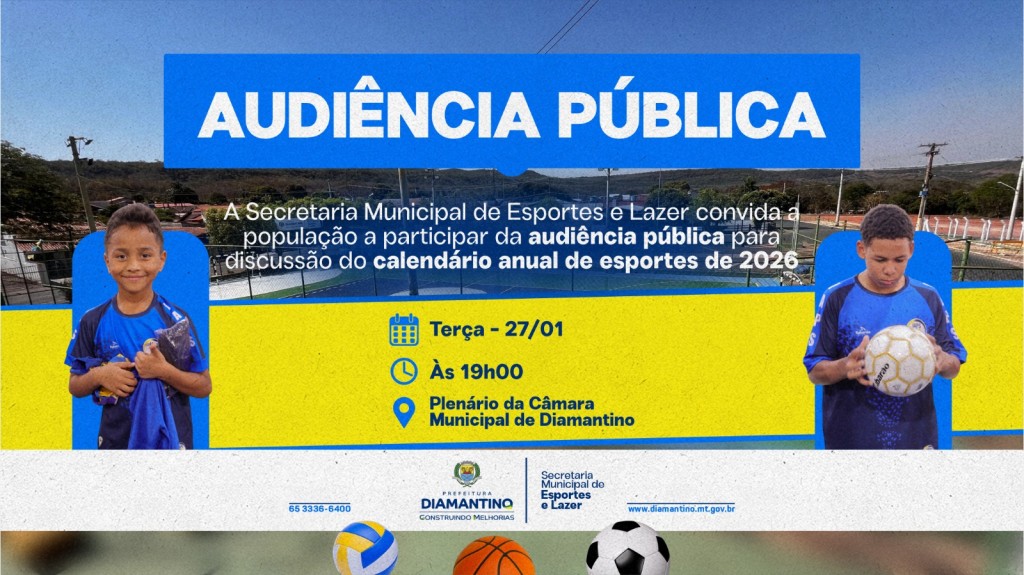 A Prefeitura de Diamantino, por meio da Secretaria Municipal de Esportes e Lazer, realizará uma Audiência Pública no próximo dia (27.01) às 19h, no Plenário