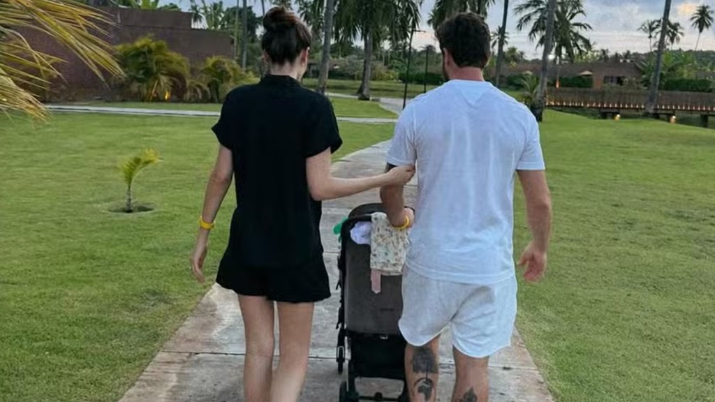 Camila Queiroz, de 32 anos, aproveitou o domingo (29) em clima de tranquilidade ao lado do marido, Klebber Toledo, de 39, e da filha Clara,