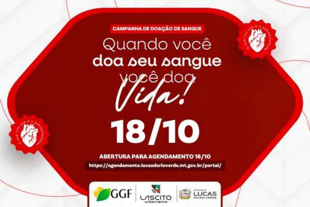 Inicia nesta quinta-feira (16), o agendamento para a Campanha de Doação de Sangue. A iniciativa é da Secretaria Municipal de Saúde de Lucas do Rio Verde e Banco de Sangue de Sorriso, com o apoio do Grupo Corrente Pela Vida e patrocínio da Guimarães Agrícola.