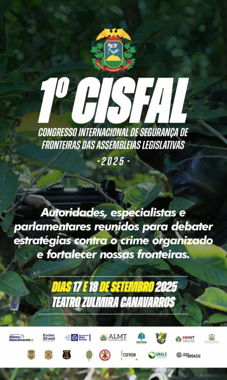 A Assembleia Legislativa de Mato Grosso (ALMT) realiza, nos dias 17 e 18 de setembro, o 1º Congresso Internacional de Segurança de Fronteiras das Assembleias Legislativas, uma iniciativa inédita promovida pela Comissão de Segurança Pública e Comunitária da ALMT, presidida pelo deputado estadual Elizeu Nascimento (PL). O evento será realizado no Teatro Zulmira Canavarros, em Cuiabá, com início às 9h da manhã desta quarta-feira (17), e é aberto à comunidade.
