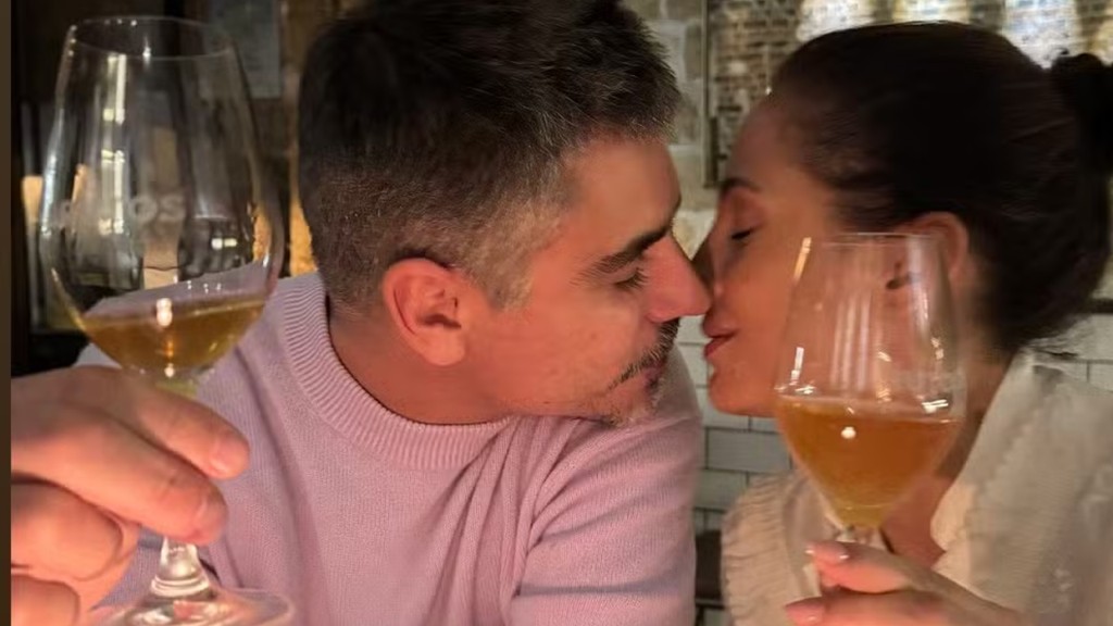 Nos registros compartilhados nesta sexta-feira (14), a artista aparece em total clima de romance em uma restaurante da região. O casal está com taças de vinho nas mãos e ameaçando dar um beijo. “Os brutos também amam”, escreveu ela na foto.