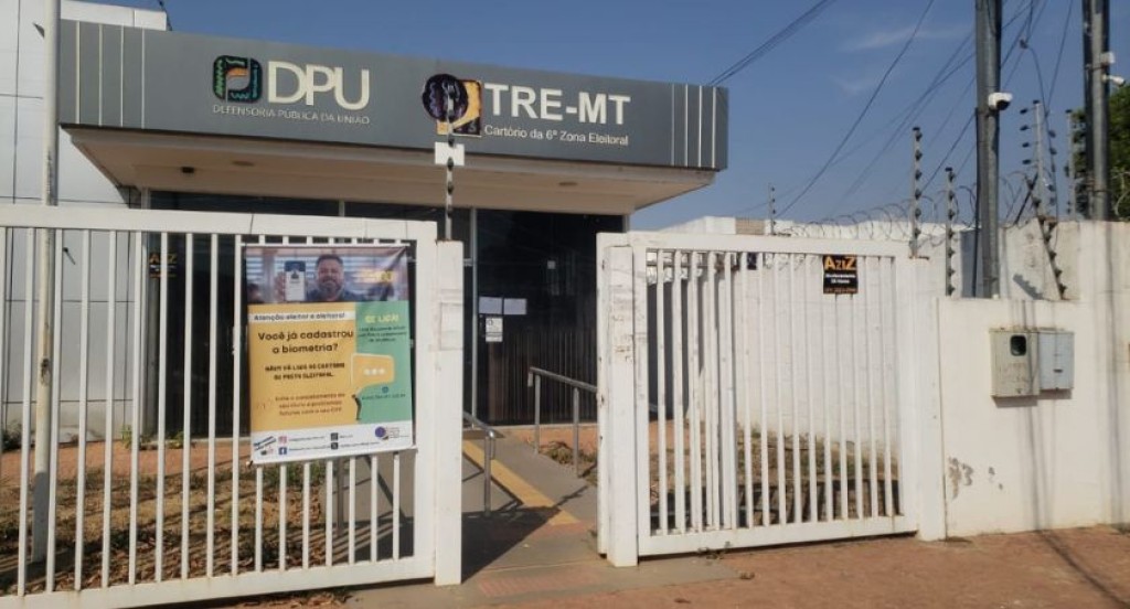 #PraTodosVerem: A imagem mostra a entrada do Cartório da 6ª Zona Eleitoral, em Cáceres (TRE-MT), que funciona no mesmo prédio da Defensoria Pública da União (DPU). O local é cercado por grade branca, onde está afixado um cartaz de campanha de incentivo ao cadastro biométrico.