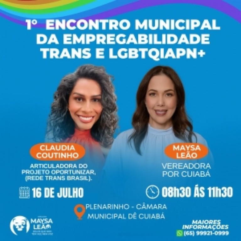 Com o objetivo de promover um debate urgente e necessário sobre a inclusão no mercado de trabalho, a vereadora Maysa Leão (Republicanos), em parceria com o Projeto Oportunizar, realiza no próximo dia 16 de julho, das 8h30 às 11h30, no Plenarinho da Câmara Municipal de Cuiabá, o 1º Encontro Municipal da Empregabilidade Trans e LGBTQIAPN+.