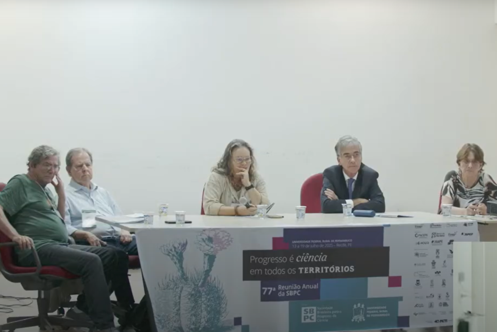 O debate reuniu o secretário-executivo do Ministério da Ciência, Tecnologia e Inovação (MCTI), Luís Fernandes; os presidentes de honra da SBPC, Sérgio Rezende e Ildeu Moreira; e a presidente da Academia Brasileira de Ciência (ABC), Helena Nader. A mesa foi mediada pela vice-presidente da SBPC, Francilene Garcia.
