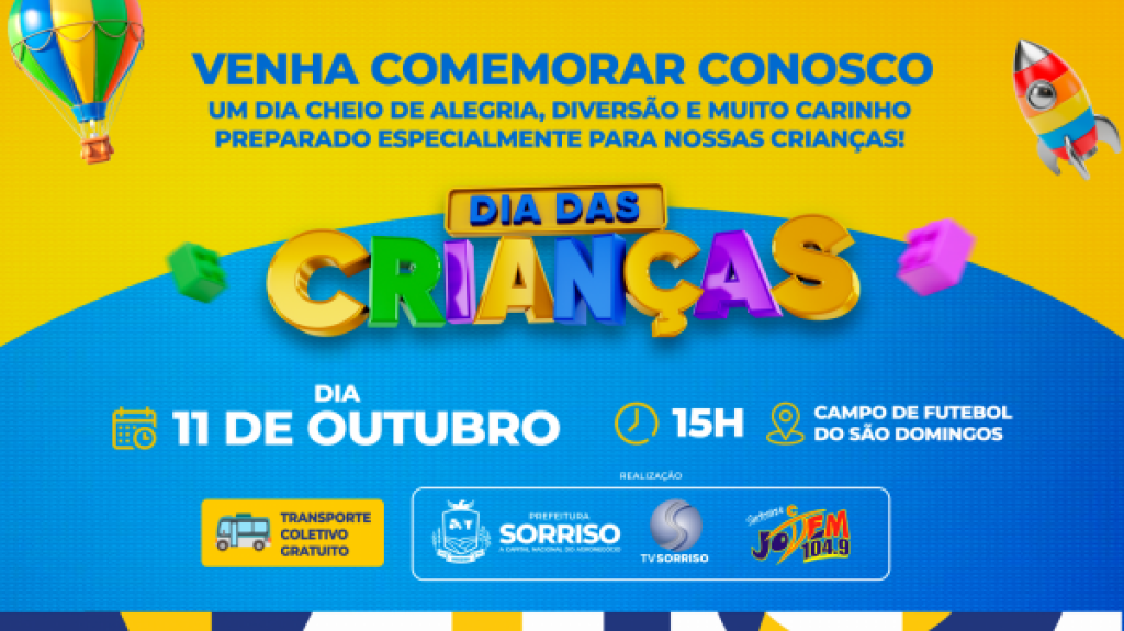 A comemoração do Dia das Crianças promete ser de muita alegria e carinho. No próximo sábado, 11 de outubro, a partir das 15h, a Prefeitura de Sorriso, em parceria com a TV Sorriso – Rede Record e a Jovem FM, transformará o Campo do São Domingos em um verdadeiro espaço de lazer, saúde e convivência para as famílias da comunidade.