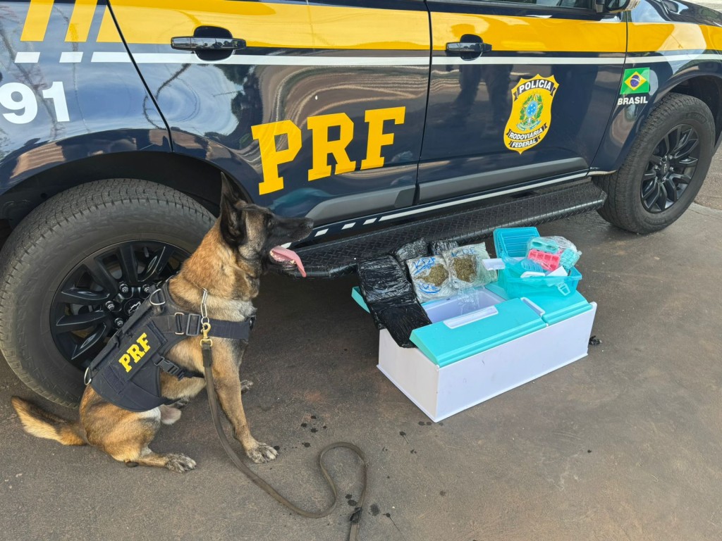 A equipe da PRF abordou um veículo Renault/Master que fazia transporte de encomendas. Durante os procedimentos de fiscalização, foi empregado o cão farejador K9 Zion, que indicou a presença de entorpecentes em uma das caixas transportadas no compartimento de carga. Ao abrir o volume, os policiais localizaram uma geladeira infantil que escondia oito tabletes de substância com características semelhantes ao skunk, droga derivada da maconha com alto teor de concentração de THC.