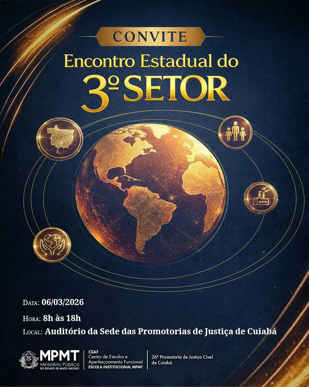 Magistrados e servidores do Poder Judiciário de Mato Grosso estão convidados para o Encontro Estadual do Terceiro Setor, que será realizado nesta sexta-feira (6 de março), a partir das 8h, na sede das Promotorias de Justiça de Cuiabá. O evento reunirá especialistas e representantes de organizações da sociedade civil para discutir as melhores práticas de atuação, governança e fortalecimento das fundações privadas em Mato Grosso. As inscrições são gratuitas e estão abertas, clique aqui.