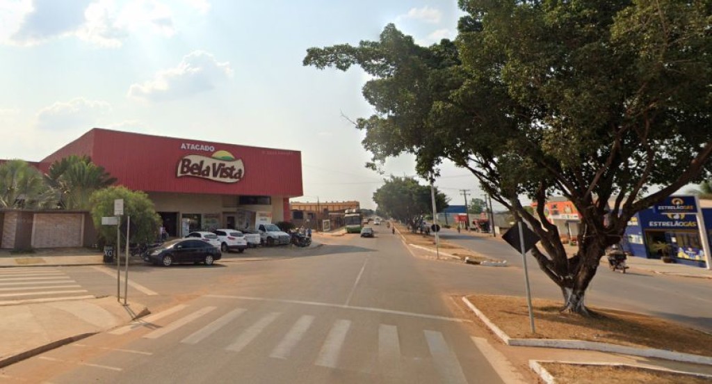 #PraTodosVerem – A imagem mostra uma via urbana em um dia ensolarado, com um supermercado de fachada vermelha chamado “Atacado Bela Vista” à esquerda e algumas motos e carros estacionados em frente. À direita, há uma grande árvore fazendo sombra sobre a calçada e, mais ao fundo, comércio local e veículos seguindo pela avenida, compondo um cenário típico de uma rua movimentada da cidade.