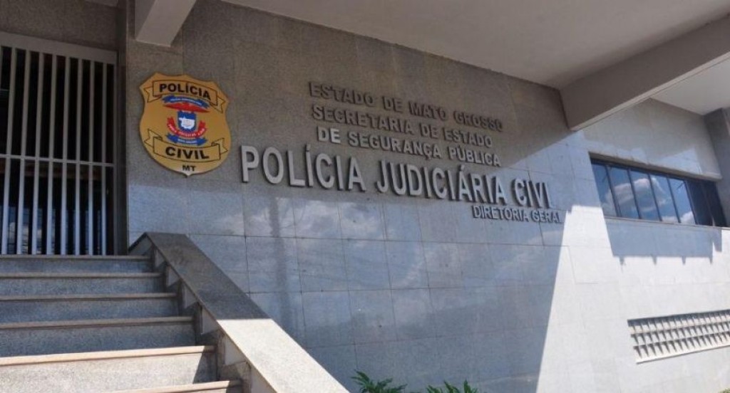 #PraTodosVerem: A imagem mostra a fachada do prédio da Polícia Judiciária Civil de Mato Grosso. O letreiro espelhado indica as frases: “Estado de Mato Grosso” e “Secretaria de Estado de Segurança Pública” em letras menores; “Polícia Judiciária Civil” em letras grandes, com “Diretoria Geral” abaixo, em letras pequenas. Ao lado, o logotipo da Polícia Civil. As paredes são cinzas e há uma escada no canto inferior esquerdo, que leva a um portão com grades.