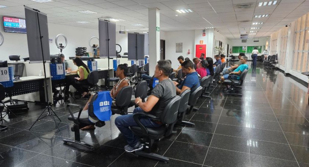 #PraTodosVerem – A imagem mostra uma sala de atendimento ao público, onde diversas pessoas aguardam sentadas em fileiras de cadeiras. À esquerda, há guichês com equipamentos de biometria e servidores realizando atendimentos. O ambiente é amplo, bem iluminado, com piso de cerâmica escura e teto com luminárias fluorescentes. Ao fundo, vê-se um painel eletrônico exibindo senhas de atendimento e mais cidadãos sendo atendidos.