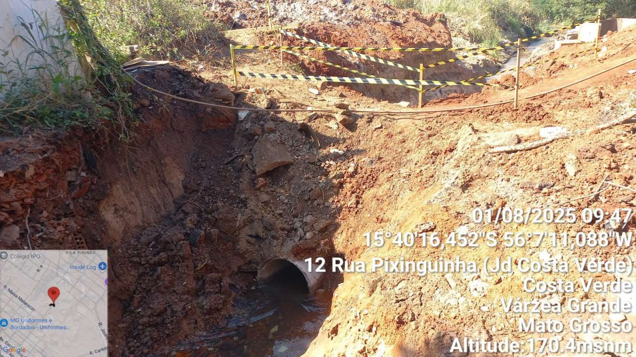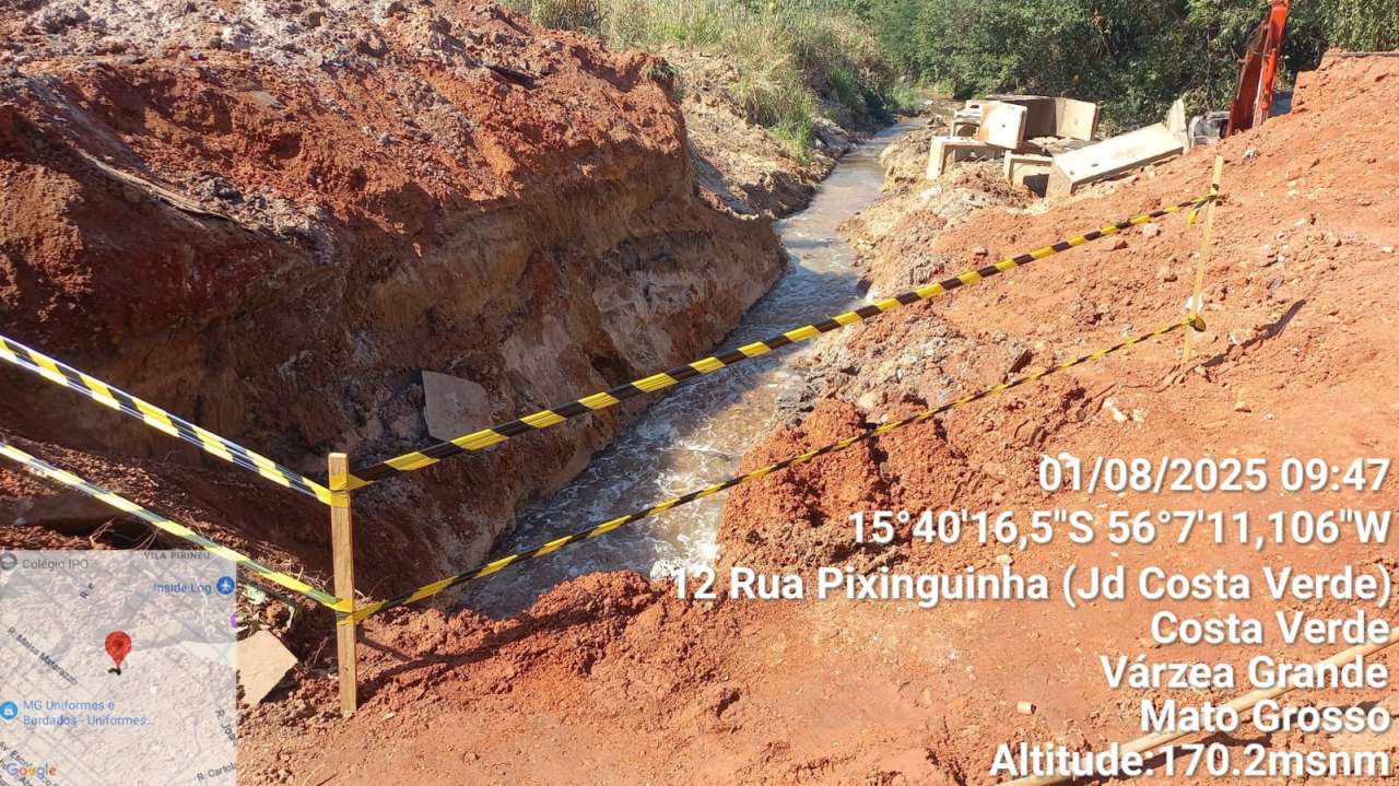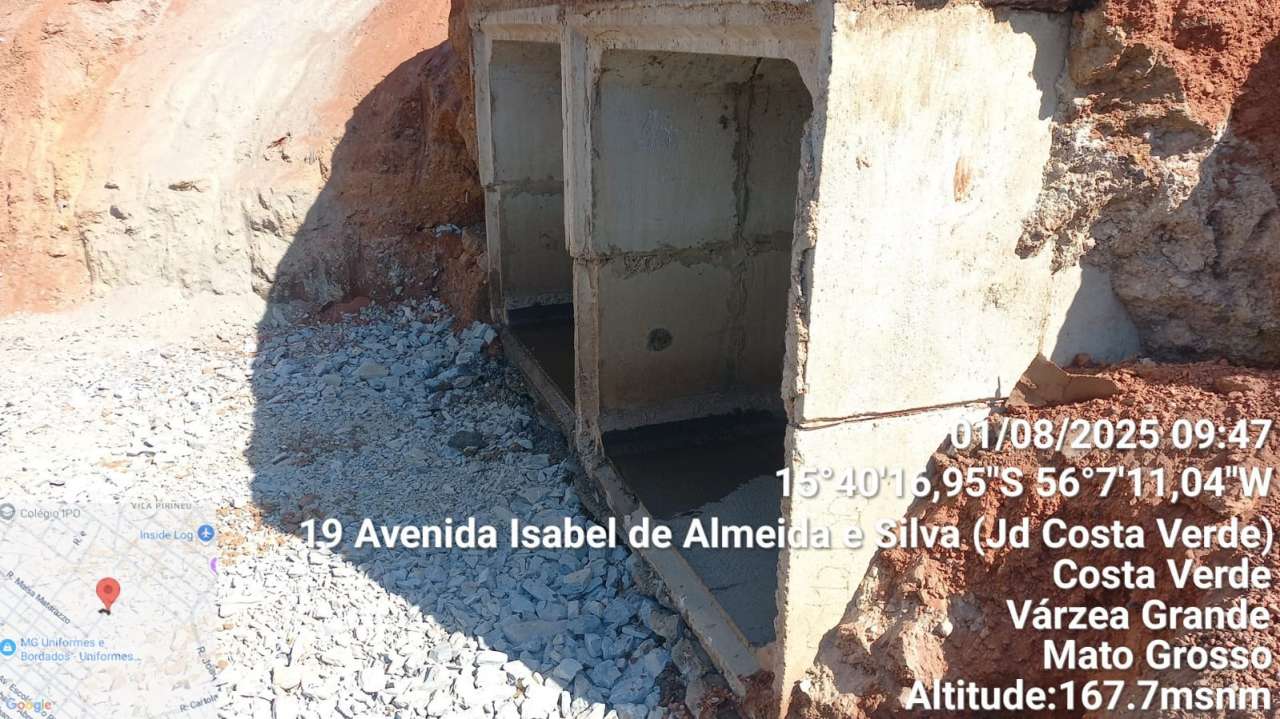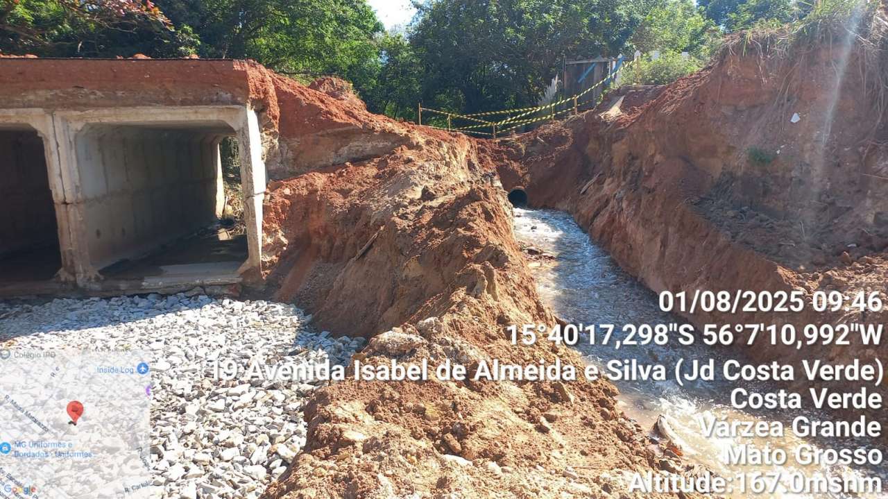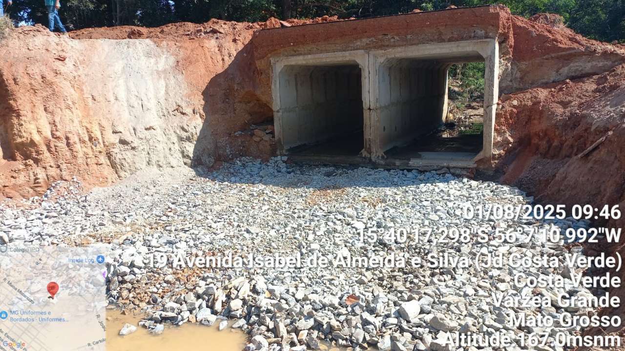 A Prefeitura de Várzea Grande informa que estão em andamento as obras na Avenida Elvira Monteiro, no bairro Costa Verde, para reconstrução da travessia sobre o córrego Água Limpa, com prazo estimado de 30 dias para conclusão.