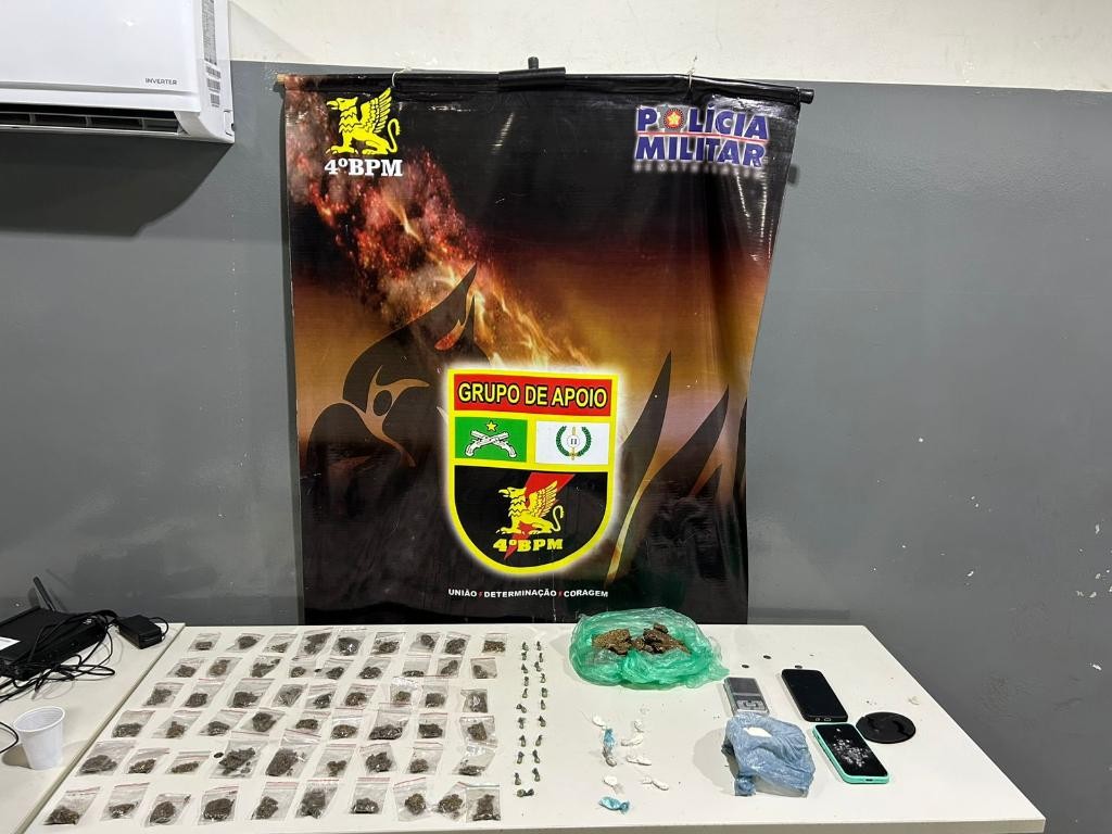 Os militares foram até o ponto indicado pelo homem e encontraram uma sacola contendo 55 porções de substâncias análogas a maconha, 21 porções de pasta base de cocaína e 10 porções de cocaína, além de uma balança de precisão e outros materiais do tráfico.