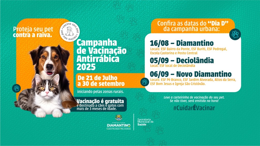 “Como médico veterinário, reforço que a vacinação antirrábica é essencial. Ela protege os animais, impede a transmissão do vírus e previne casos em humanos. A raiva não tem cura após o aparecimento dos sintomas, por isso, vacinar é a maneira mais eficaz de cuidar da saúde dos nossos animais e da população.”