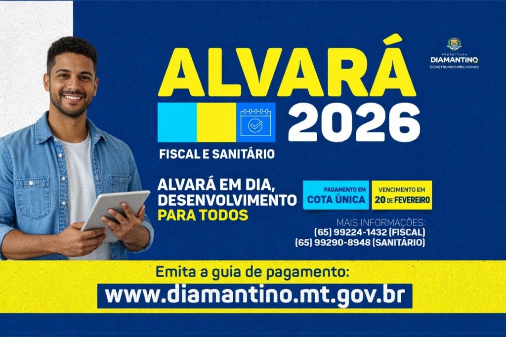 A Prefeitura de Diamantino, por meio da Secretaria Municipal de Fazenda, através do Decreto Municipal nº 013/2026, prorrogou o prazo para pagamento das Taxas de emissão do Alvará de Localização e Funcionamento e da Taxa de Vigilância Sanitária, referentes ao exercício de 2026. A nova data de vencimento passa a ser 20 de fevereiro de 2026.