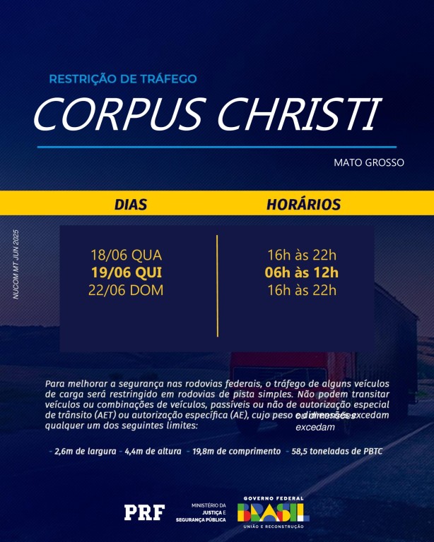 A Polícia Rodoviária Federal (PRF) dará inicio, nesta quarta-feira (18), a Operação Corpus Christi 2025. A mobilização segue até o domingo (22), com reforço no patrulhamento das rodovias federais que cortam Mato Grosso, buscando reduzir acidentes e garantir mais segurança para quem vai viajar durante o feriado prolongado.