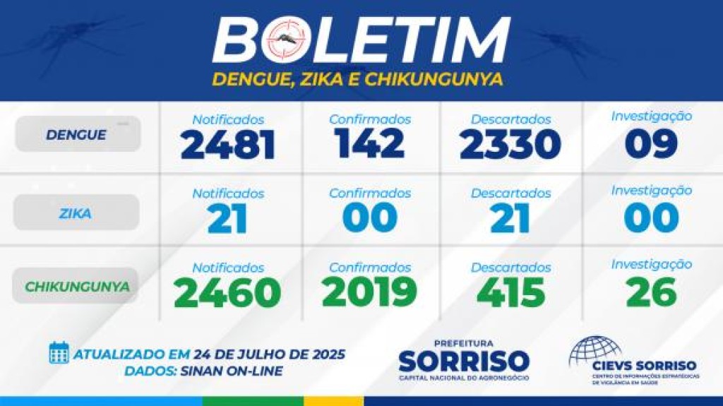 Sorriso voltou a registrar alta nos casos de chikungunya. Desde o dia 9 de julho, quando o último boletim de arboviroses foi divulgado, até esta manhã, 24 de julho, 415 novos casos foram contabilizados, totalizando 2.019 registros desde janeiro até o momento. Na primeira semana de julho eram 1.568 situações. Os dados atualizados foram divulgados nesta manhã, 24, pela Secretaria de Saúde, por meio do Centro de Informações Estratégicas de Vigilância em Saúde (Cievs) e constam no Sistema Sinan On-line.