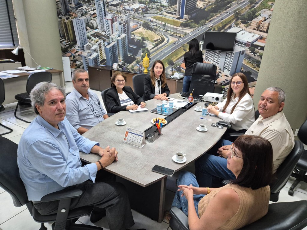 A foto mostra os participantes da reunião reunidos em volta de uma mesa grande na sala do secretário de Meio Ambiente de Cuiabá.