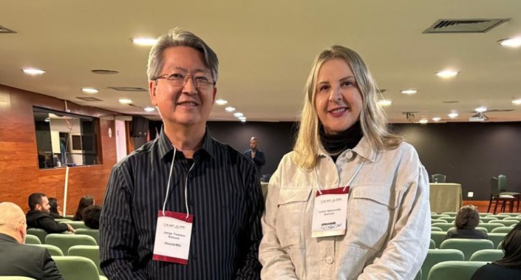 #PraTodosVerem: A imagem mostra o servidor Jorge Yoshiro Kimura, vestindo uma camisa de botão com listras cinzas, e a servidora Lener Aparecida Galinari, com uma camisa de botão branca. Eles usam a credencial no pescoço. Ao fundo, é possível ver um auditório com cadeiras verdes. Há pessoas sentadas, olhando para frente.