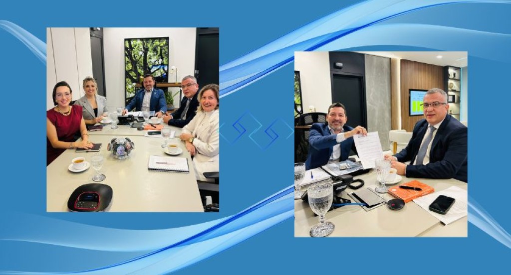 #PraTodosVerem: A imagem é composta por duas fotografias sobre um fundo azul com ondas claras. Na foto à esquerda, cinco pessoas estão sentadas ao redor de uma mesa de reunião, sorrindo para a câmera, com xícaras de café e materiais de anotação sobre a mesa. Na foto à direita, dois homens, o corregedor regional eleitoral e o secretário de Estado de Planejamento, também sentados à mesa, posam mostrando um documento assinado, em gesto de parceria ou acordo.