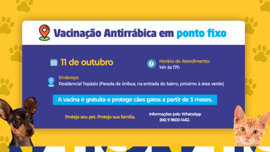Neste sábado (11), será realizada mais uma ação da Campanha de Vacinação Antirrábica em ponto fixo, desta vez no Residencial Topázio. As equipes estarão realizando vacinação, das 14h às 17h, na parada de ônibus da entrada do bairro, próximo à área verde.